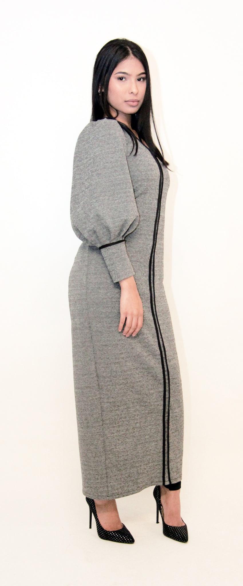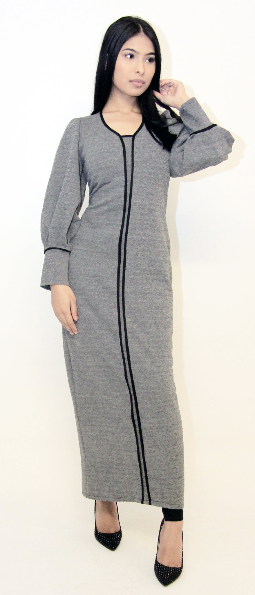 Grey full length dress in thick marl fabric. Cuff sleeves with piping detail at front.