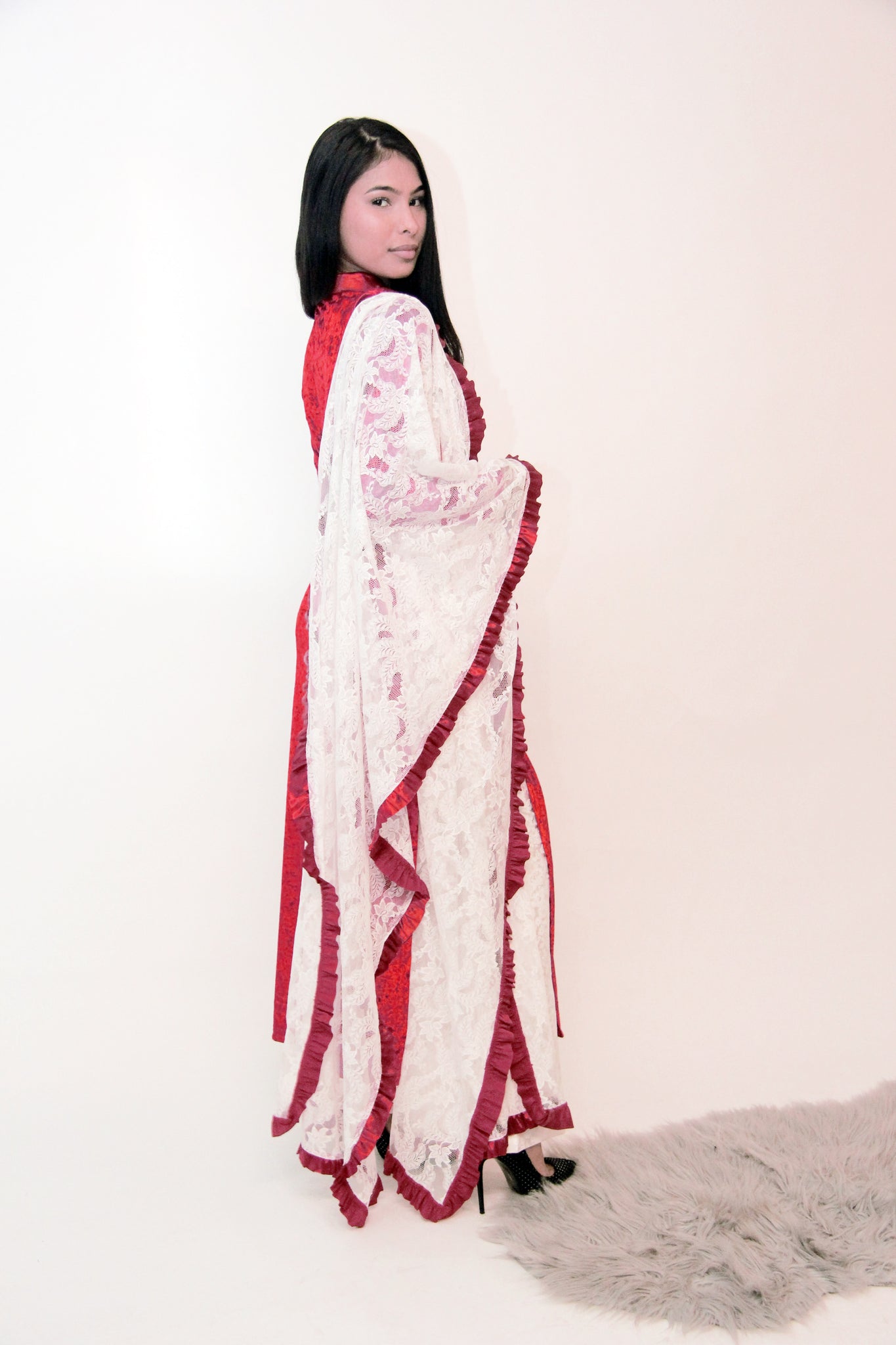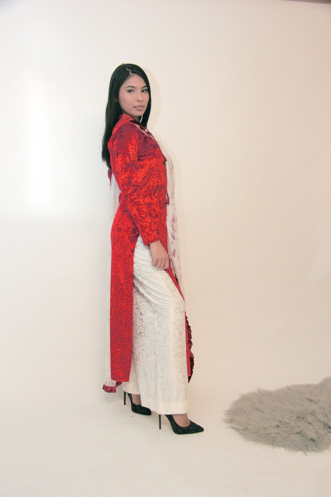 Red Velvet Chemise with loose printed stretch satin trousers and lace dupatta with red satin trim.